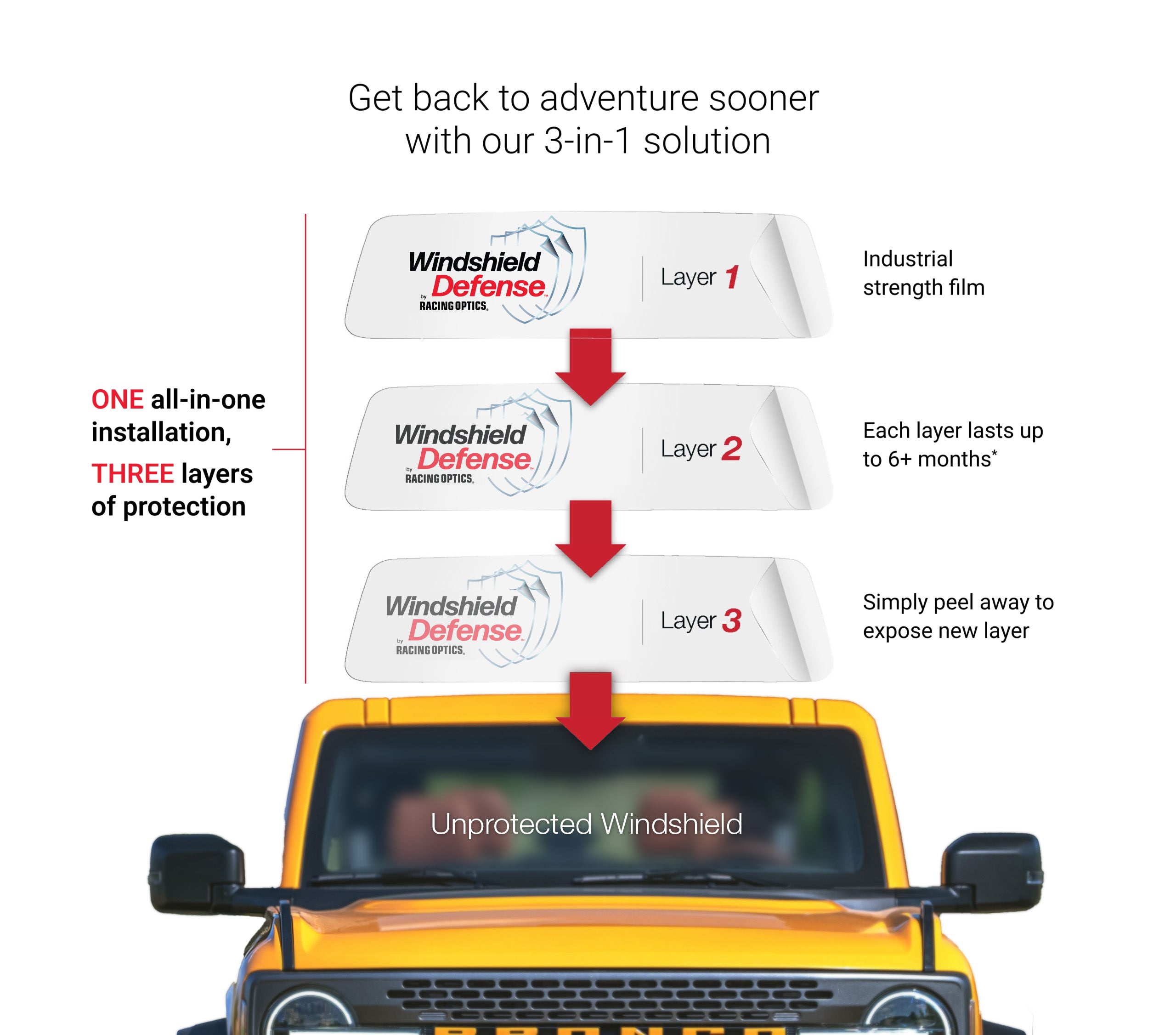 This three-layer polyester film is laser-cut to fit the windshield of your Ford® Bronco® and can be easily installed in just 20 minutes. Depending on usage and environment, each industrial strength layer can provide six months or more of protection from chipping, pitting, cracking, and breaking. Much like a screen protector for your phone.