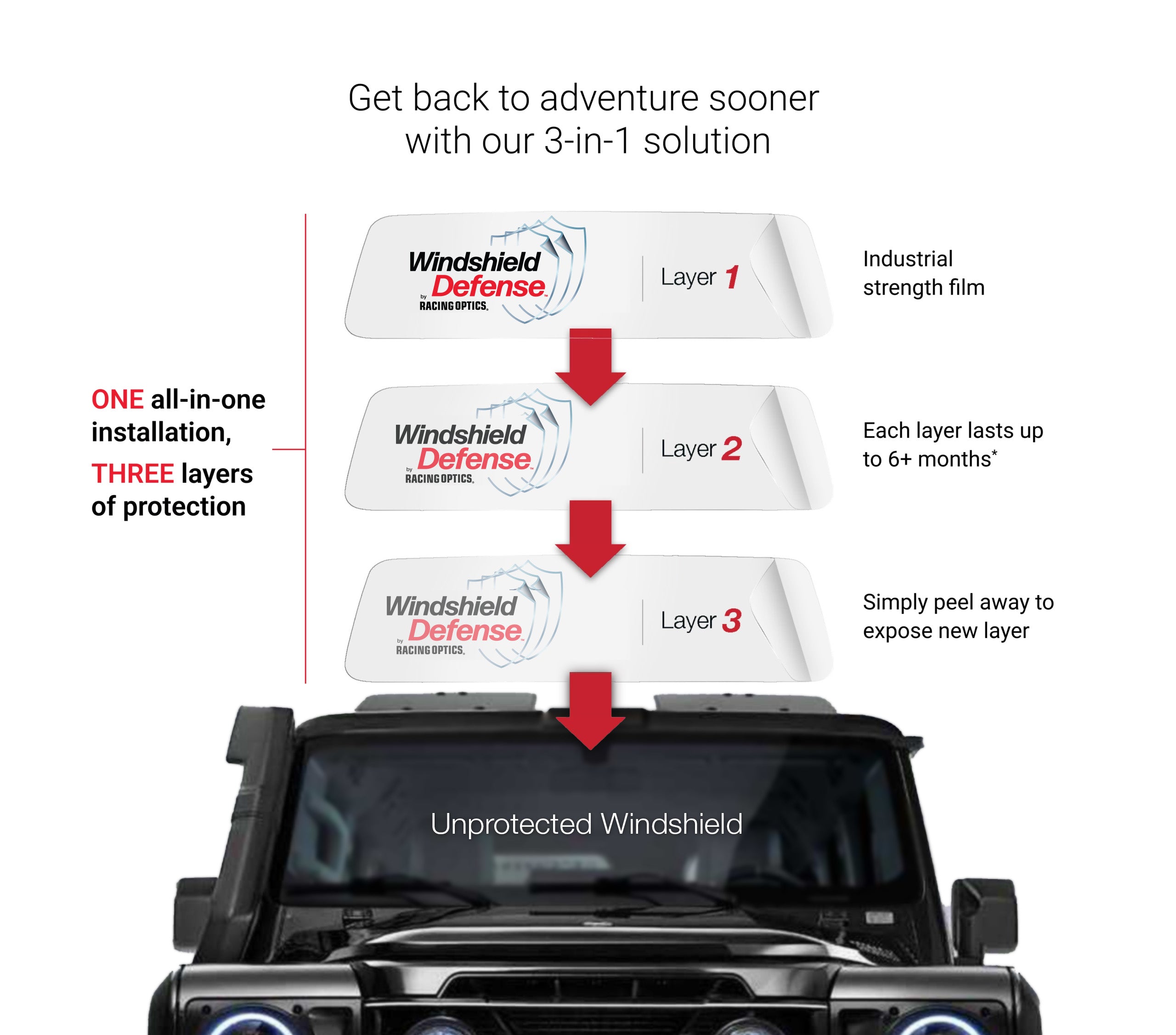 This three-layer polyester film is laser-cut to fit the windshield of your INEOS® Grenadier® and can be easily installed in just 20 minutes. Depending on usage and environment, each industrial strength layer can provide six months or more of protection from chipping, pitting, cracking, and breaking. Much like a screen protector for your phone.